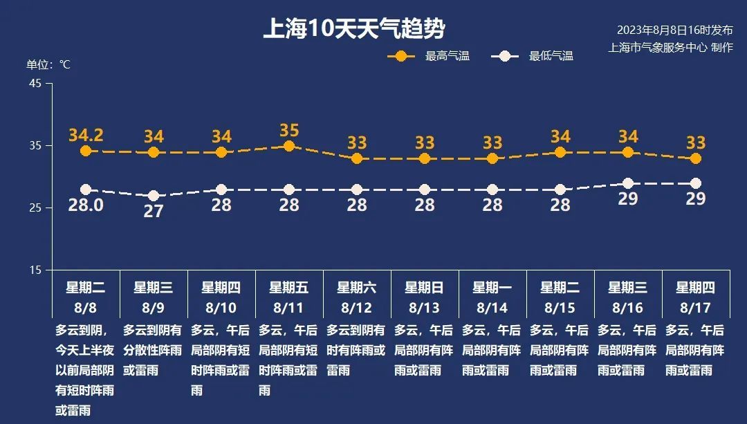 上海本周以多云天气为主,午后局部地区有阵雨或雷雨。气温也比较平稳,最低气温28~29℃,最高气温33~35℃。