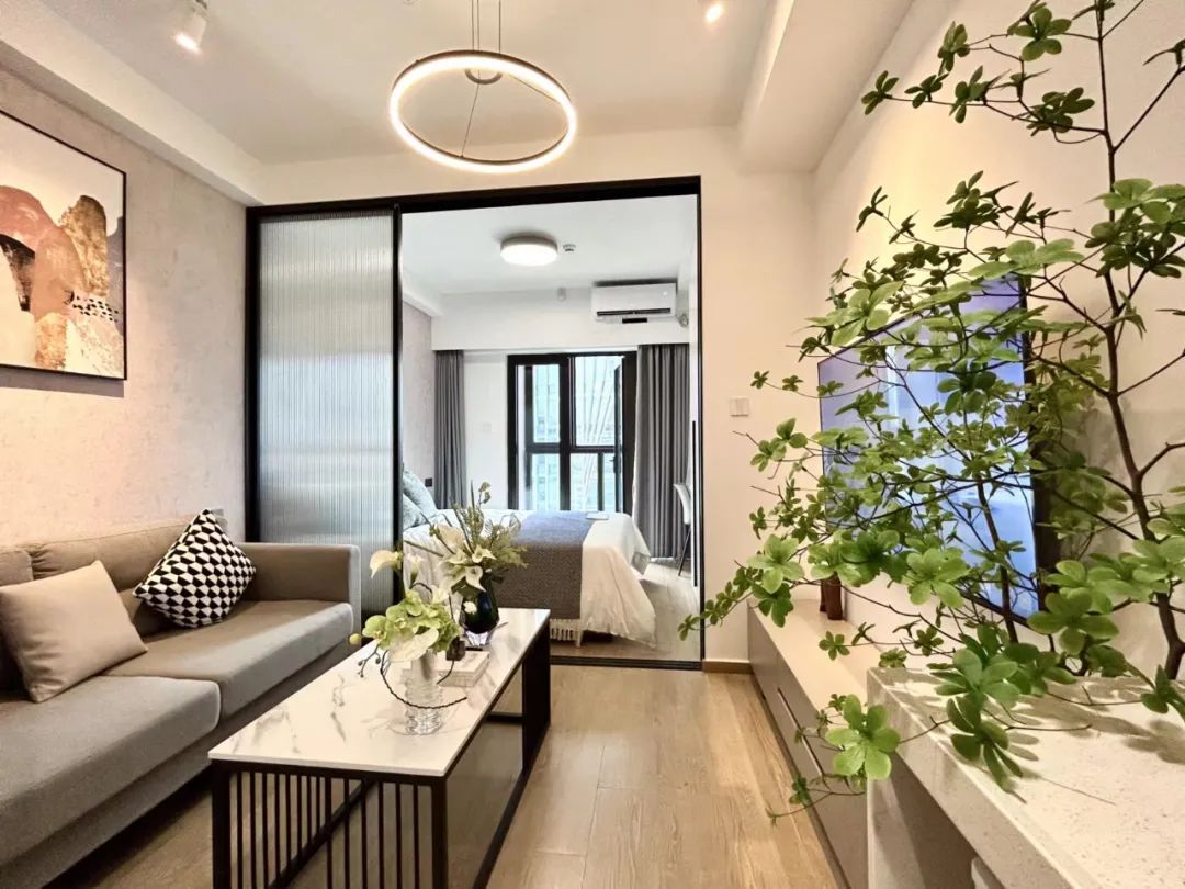 38平方米房型为studio单人公寓,有别于其他公寓,这个房型在卧室和客厅之间增加了玻璃推拉门,拉上门就是更加私密的卧室空间,同时玻璃的材质也增加了房间的采光面积,非常适合年轻人独居生活。