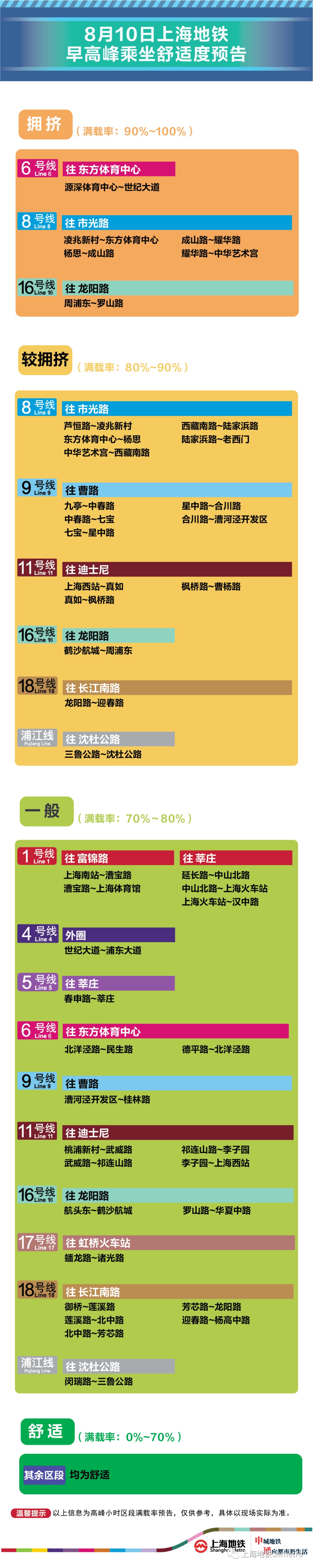 为提升上海地铁早高峰期间出行服务水平,提升乘客乘坐体验,上海地铁向乘客提供乘坐舒适度预告,方便乘客提