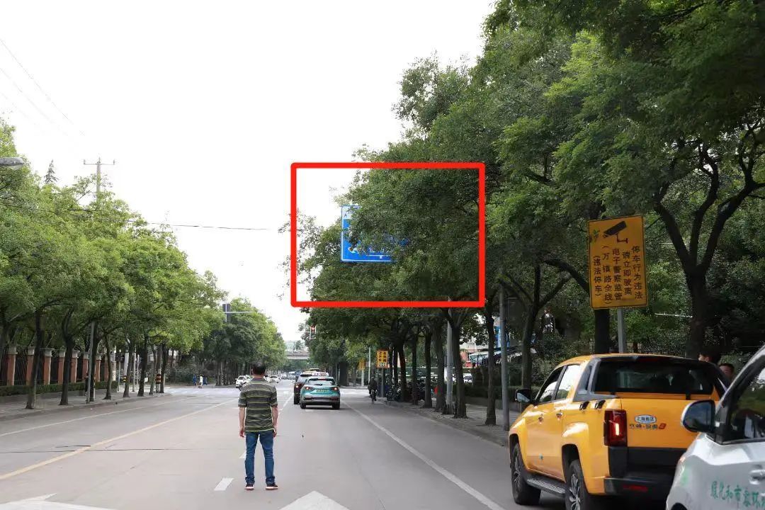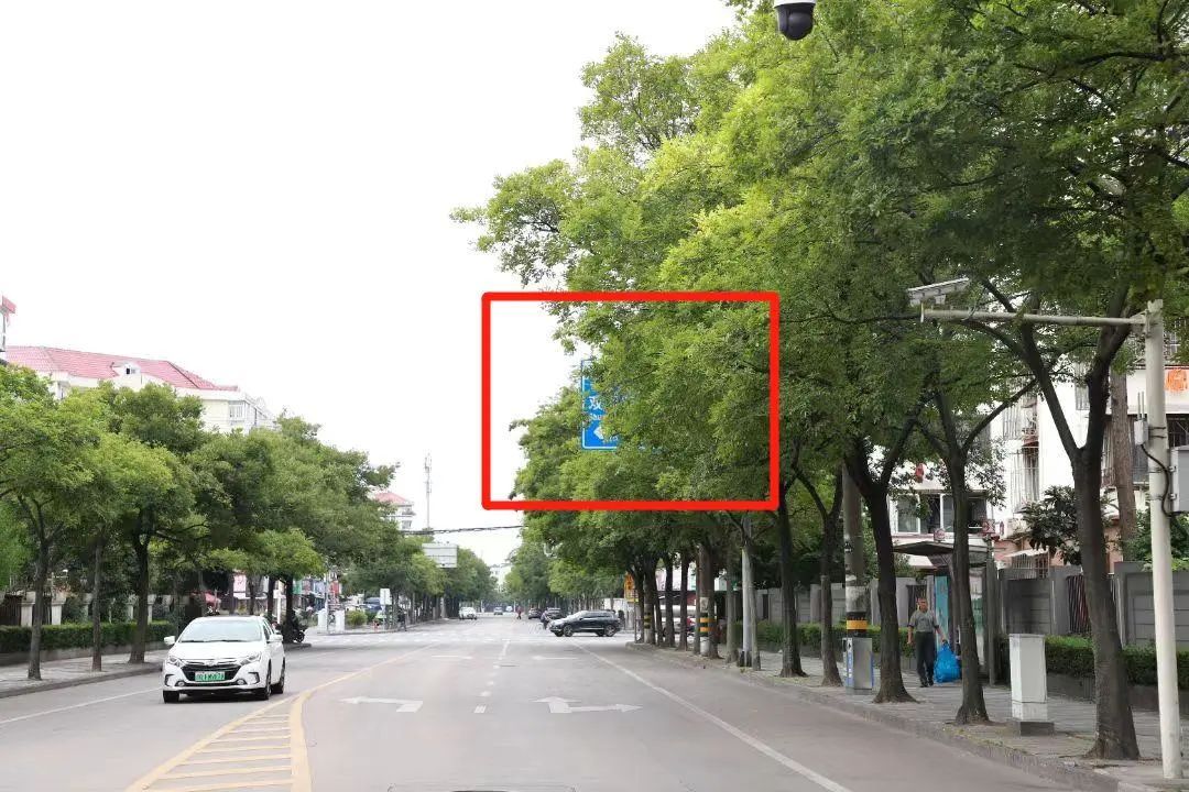 经过现场调研踏勘,结合道路行道树栽植位置、道路环境等因素,研究确定在道路另一侧适当位置处移除一棵行道树,移植的行道树位置成为标识牌的设置空间,进行反挑设置,后续绿化养护单位落实常态修剪工作,修除遮挡路牌的小枝条。另外一块牌子反向设置在小区出入口处,有效避开行道树造成的遮挡。