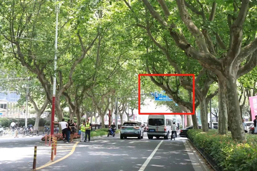 由于树木规格较大,树冠中部二、三级骨架枝对近肇嘉浜路口的3F道路标识牌造成严重遮挡。经绿化与道运部门技术人员多次现场踏勘后制定出解决方案,道运部门将标识牌移动至中间隔离带,标识牌反向设置,绿化部门配合完成相关工作。