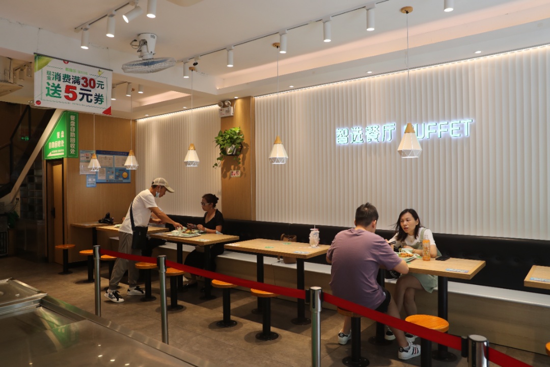 酷味乐智选饭堂拥有宽敞明亮的三层空间,设备齐全的厨房位于三楼,一楼到二楼则是主要的就餐区域,能够同时容纳130人一起用餐。记者了解到,在10:30—13:30和16:30—20:00两个时间段,居民只要手持老年卡、敬老卡、优补卡,都可以享受85折的优惠。