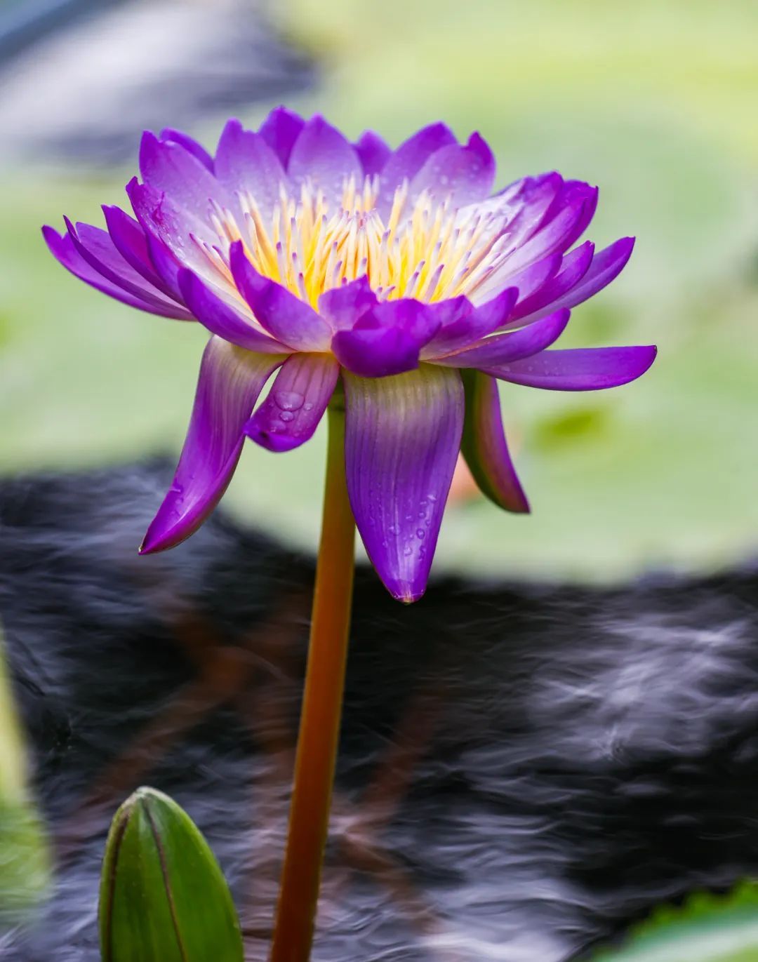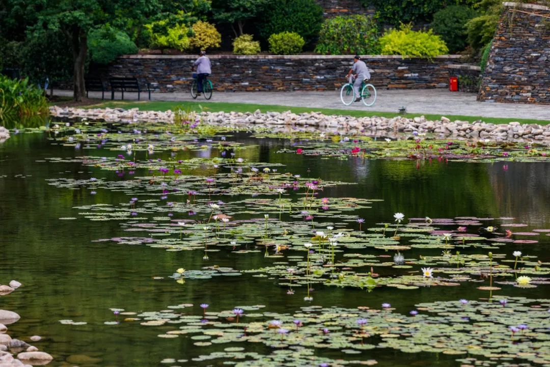 位于壳斗园溪流周边的雨洪花园区,利用辰山原有溪流景观,搭配澳洲巨花睡莲系列以及 “乔治夫人”“油画女郎”“品瓦利”等品种与多个水陆两栖植物,既增添了溪流景观的生机和灵动,又为睡莲提供了一个适宜的生长环境。