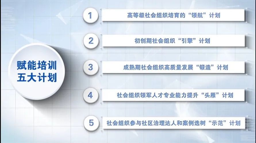 分类赋能,培养社区社会组织骨干队伍。面向不同发展阶段的社会组织实施人才赋能“五大计划”,重点实施社区治理人才培养计划,提升基层社区培育发展社区社会组织意识,有效引导社区社会组织参与社区治理。