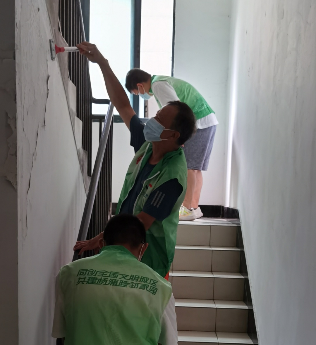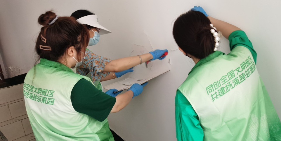 不久前,墙面修补粉刷工作正式动工。居委会干部、志愿者们分组配合,先将楼道的垃圾清理干净,再进行墙面的脱皮清理和粉刷。