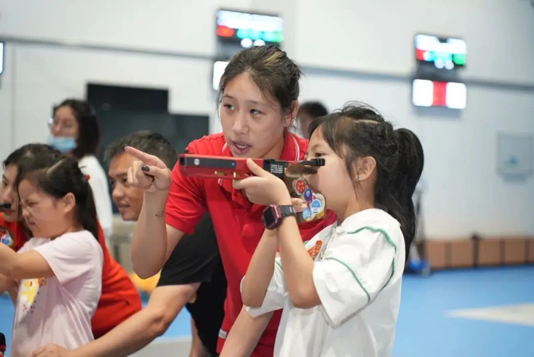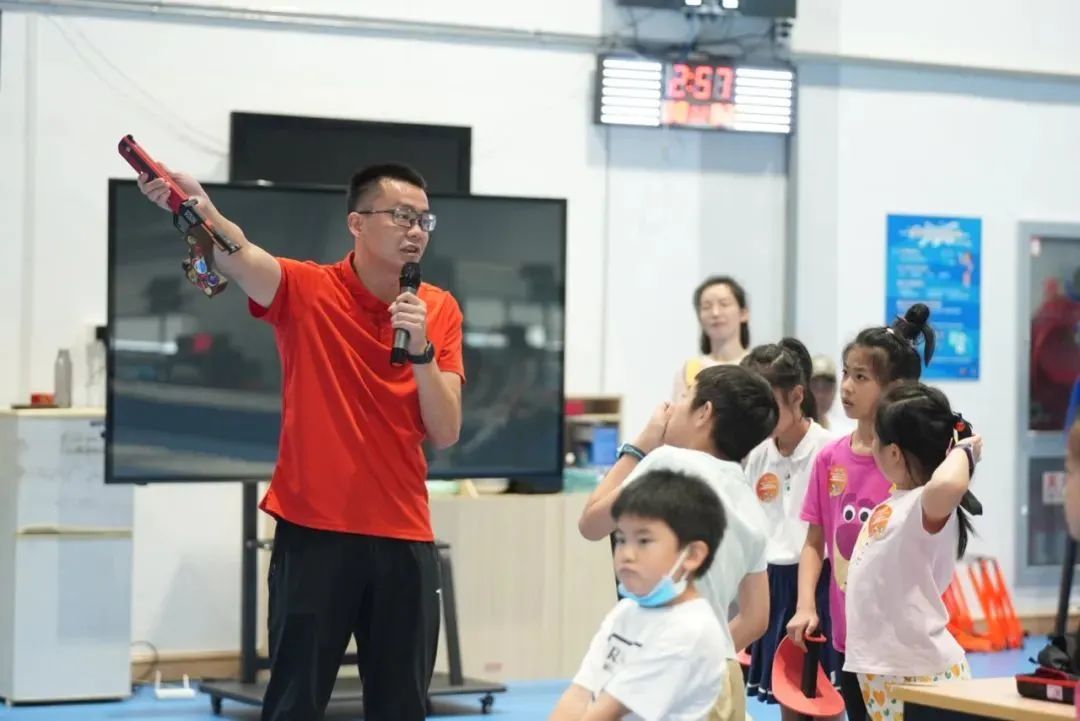 击剑体验结束后,奥运亚军、国际五项联盟教练员委员会委员曹忠荣也参与到了互动中。在曹教练的演示和指导下,市民们初步了解了现代五项这项由马术、击剑、射击、游泳及跑步5个单项运动组成的综合性比赛项目,并体验了一场刺激的射击活动,现场气氛欢快热烈。