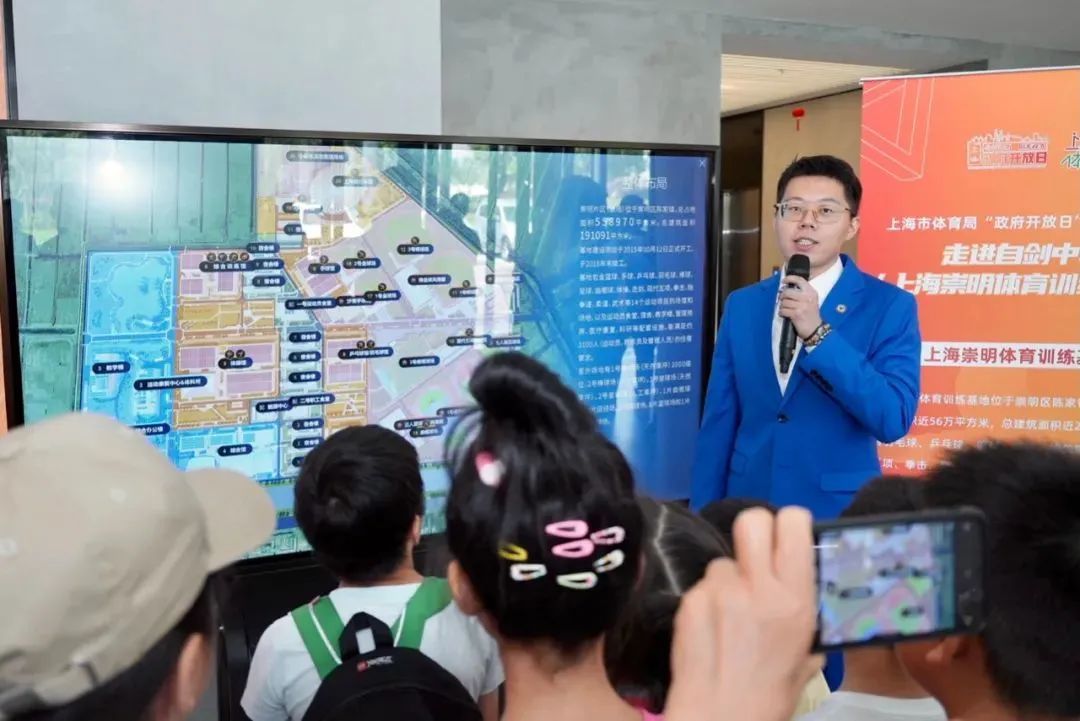 在崇明体育训练基地的全景实体沙盘旁,市民代表们初步了解了基地的概况。随后市民们乘坐基地观光车环绕训练基地一周,近距离欣赏基地的专业场馆和宜人景色,直观感受基地整体面貌。
