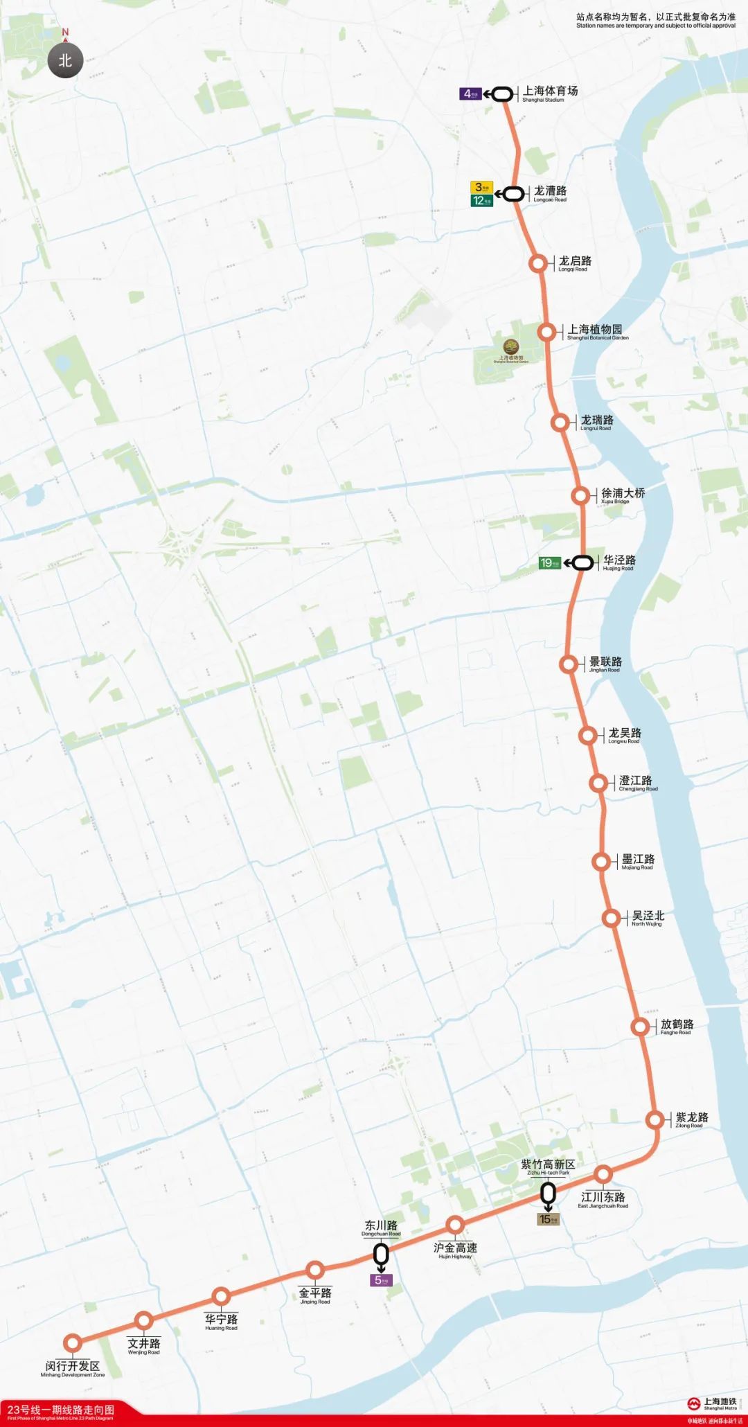 23号线是新一轮轨道交通线网中新增的市区线路,串联了闵行开发区、紫竹高新区、吴泾转型地区、徐汇滨江地区等重要区域,途经闵行区和徐汇区两大行政区。线路走向为闵行开发区-东川路-龙吴路-天钥桥路-上海体育场,均为地下线,全长约28.6千米,共设22座车站,其中换乘站6座。
