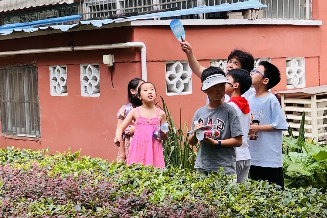 穿过凉亭,再走过旱桥,在木头堆成的昆虫屋前驻足观察,累了就在玉兰树下的圆凳休息。“嘿!过来看,这里有只七星瓢虫!”听见伙伴的呼唤,一群小朋友们跑过去,蹲在草丛边好奇地围观。