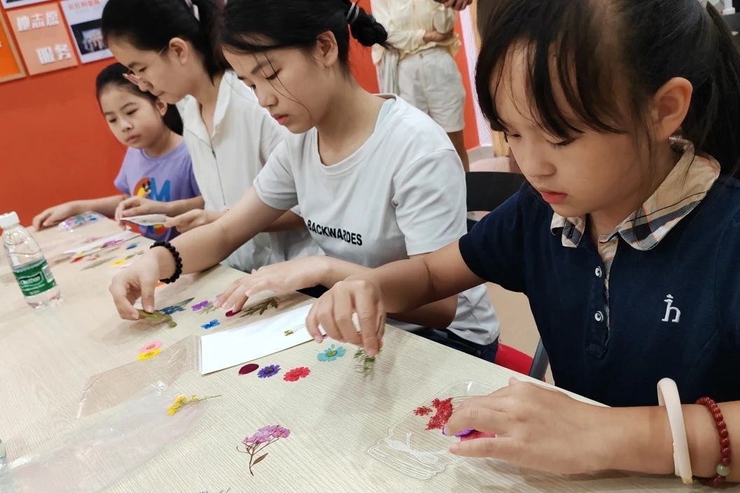 与小区的各色绿植“交完朋友”,孩子们回到长虹小区的会议室,开始制作植物标本书签。将烘干的小花小草摆放成自己心仪的样子,再贴上一层塑封膜,不一会儿,一个精美的植物标本书签就做好了。孩子们小心地给书签装上流苏,系上蝴蝶结丝带,将这次走进社区的美好回忆珍藏在心里。