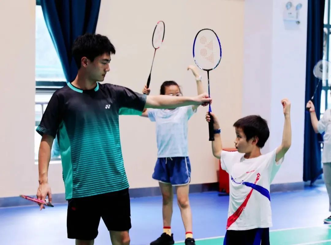 在足球少年燃动绿茵的同时,羽毛球馆内,教练们正在有针对性地对羽毛球班小学员们的动作技巧进行指导和纠正。