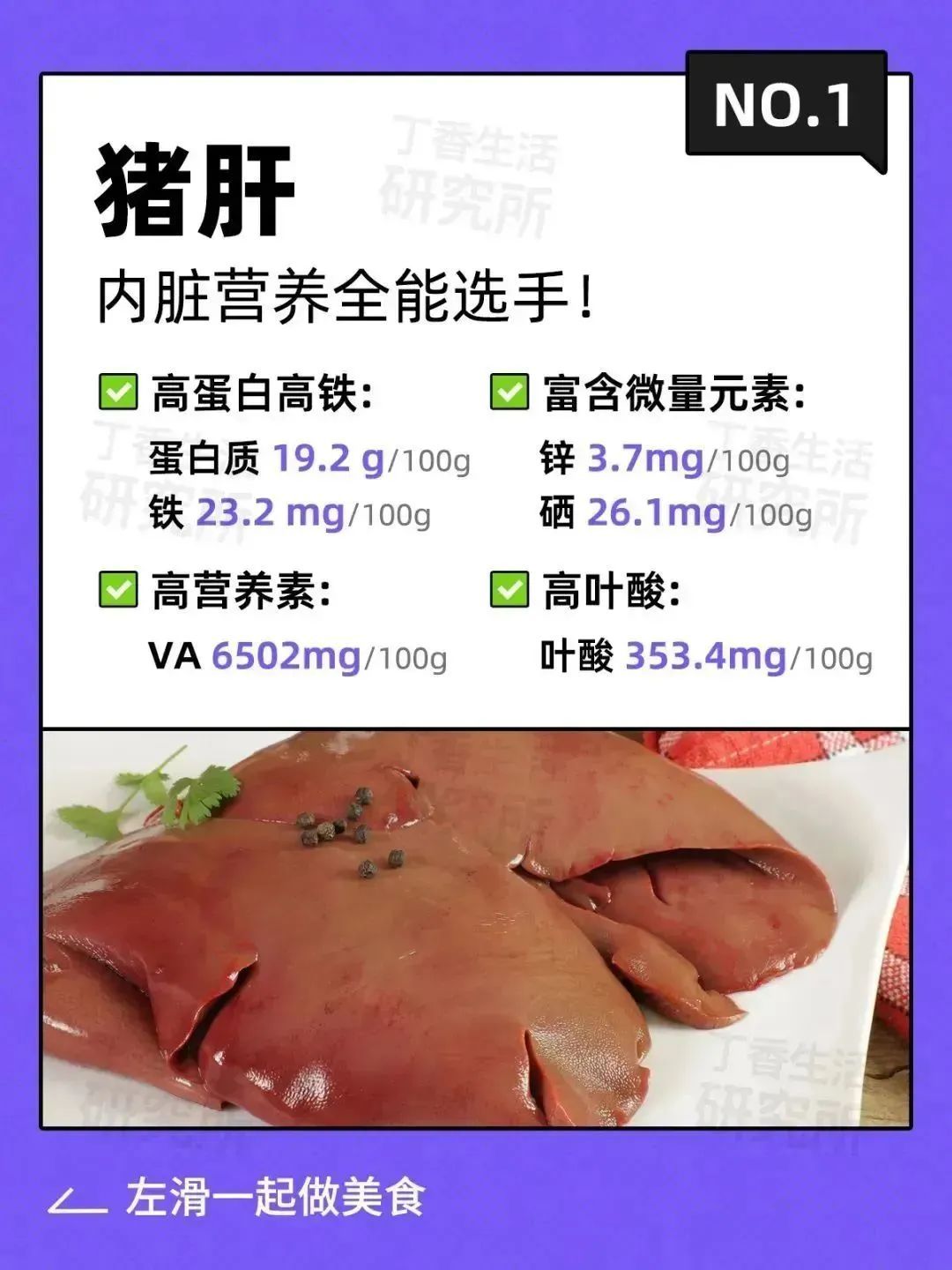 猪肝不仅美味,也是内脏中当之无愧的“全能选手”。它与鸡胗、牛肚一样,属于高蛋白、低脂肪食物。另外,猪肝中的锌、硒、铁、维生素A、叶酸等含量也很丰富,尤其是猪肝中的铁是血红素铁,更易被身体吸收。经常贫血、气血不足、易疲劳乏力的人,可以多吃猪肝。