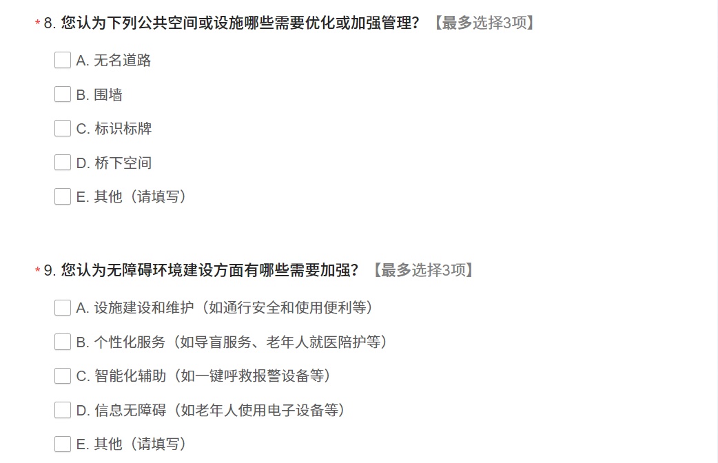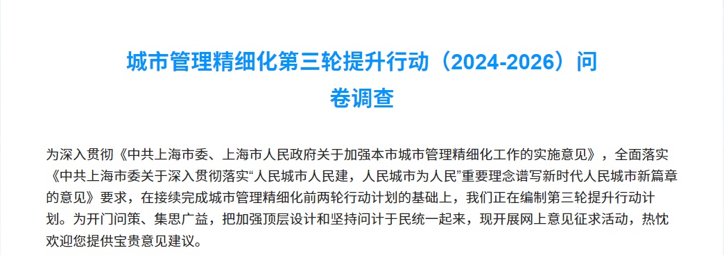 市住建委介绍,在接续完成城市管理精细化前两轮行动计划的基础上,现正在编制第三轮提升行动计划。为开门问策、集思广益,把加强顶层设计和坚持问计于民统一起来,现面向广大市民开展网上意见征求活动。大家可以点击“阅读原文”进入调查问卷并进行填写,填写时间为8月11日-9月15日,热忱欢迎您提供宝贵意见建议。期待您的参与↓
