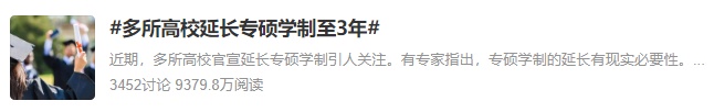 过去几年,国内多所高校已经开始对研究生学制进行调整,延长学制,尤其是专硕学制,成为了一种趋势。去年10月,话题#多所高校延长专硕学制至3年#一度冲上微博热搜,引发广泛关注。