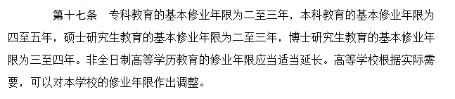根据国家高等教育基本制度规定,硕士研究生教育的基本修业年限为二至三年,博士研究生教育的基本修业年限为三至四年。非全日制高等学历教育的修业年限应当适当延长。高等学校根据实际需要,可以对本学校的修业年限作出调整。