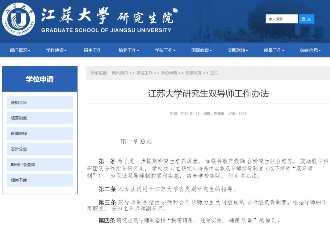 江苏大学研究生院则于去年1月发布了《江苏大学研究生双导师工作办法》,工作办法提出为了进一步提高研究生培养质量,加强科教产教融合研究生联合培养,鼓励教学科研团队合作指导研究生,专业学位研究生培养由校内指导教师(主导师)和校外实践指导教师(副导师)共同指导。在学校共建的联合培养基地中进行科教产教联合培养的研究生也由双导师共同指导。