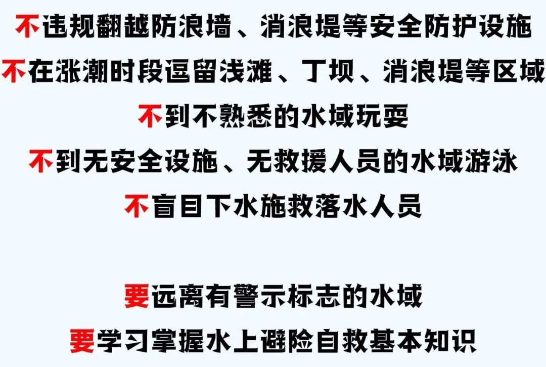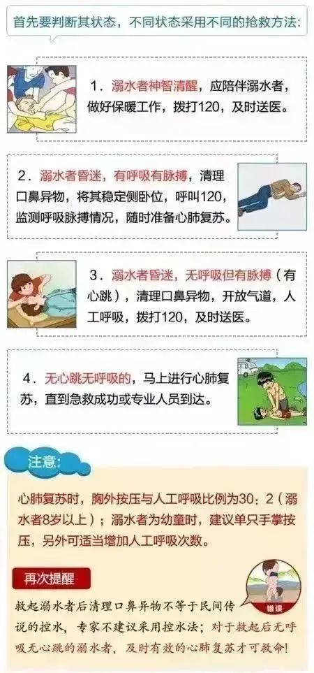 就地取材施援手 如果落水者离岸边不远,可就近寻找救生圈、绳子、竹竿、木板等抛向落水者,让其攀扶或将其拖至岸边,拖拽救援时需伏地降低重心,以免被拉入水中。 下水救援讲方法 需要下水救人时,最好绕到落水者身后,千万不要迎面施救,以免被抱死。 注意:未经过专业训练请勿下水救人。 溺水者被救起后 如何急救 预防 落水 五不 两要 预防落水, 牢记“五不”,做到“两要”。 切勿盲目打卡,违规翻越围墙, 牢记12395,莫让悲伤逆流成河。