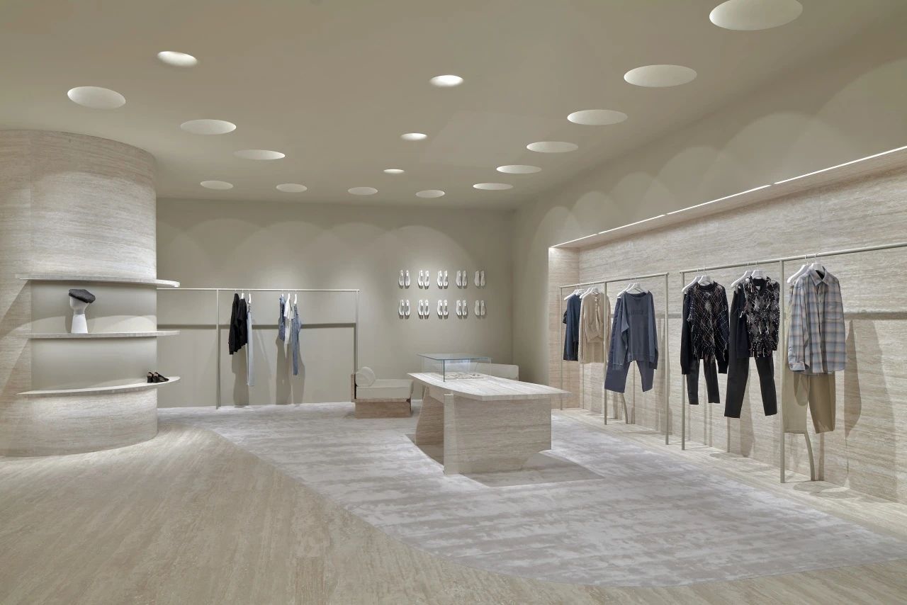 店内,成衣、鞋包、香氛分区域陈列,由石膏立柱营造出了空间分隔和错视的效果,建筑构造保留着石膏的天然纹理,露出与墙体相似的原有肌理,石膏的天然色调则进一步呼应了品牌标志性白色。