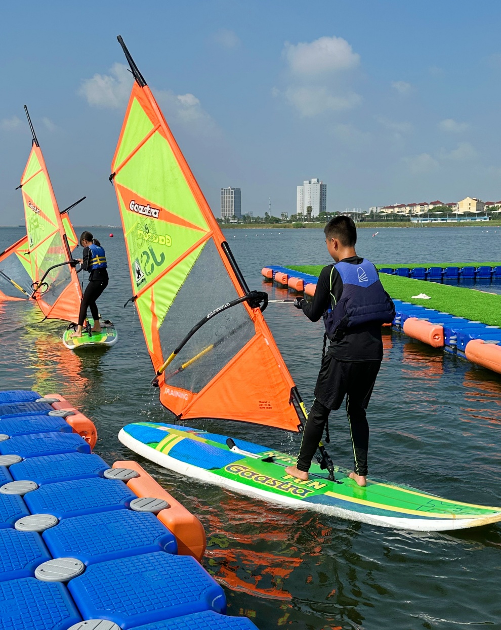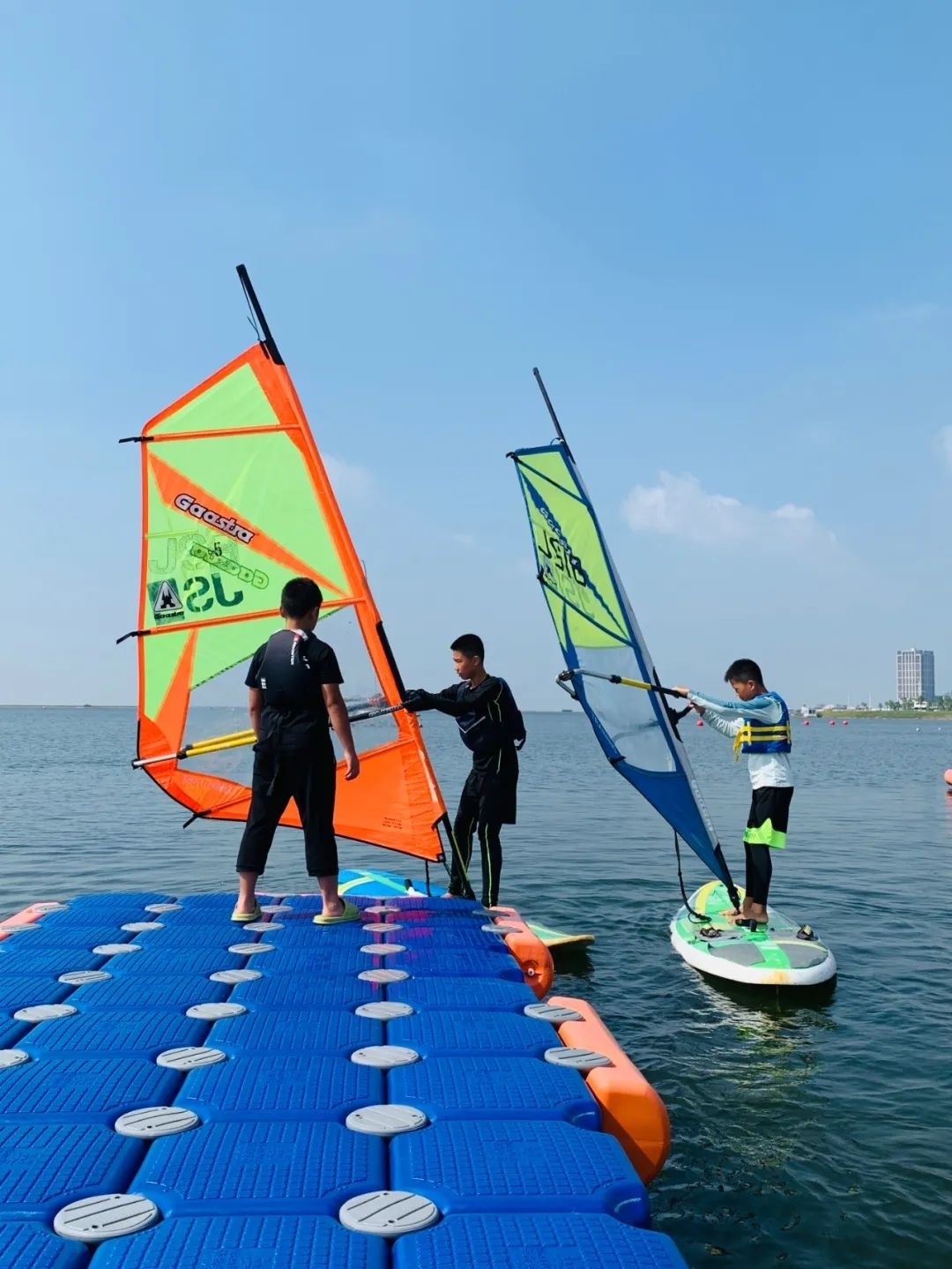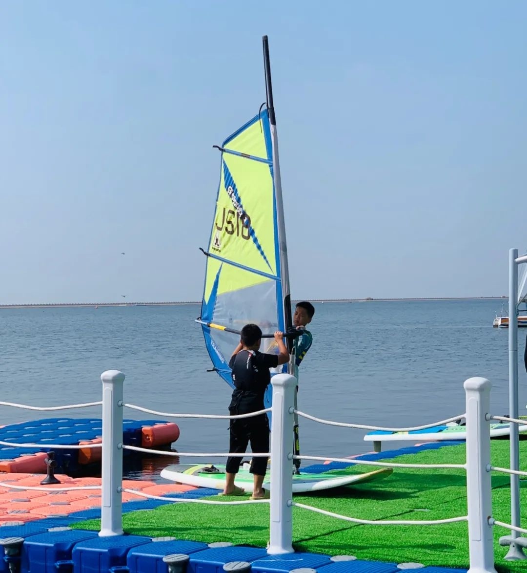 码头边,一群小选手们正准备扬帆起航。据教练介绍孩子们前期都已经通过了帆板理论教学、水域安全知识讲解、陆上模拟训练、水面操帆实战等环节的训练,才能有现在的成果。在海上,教练员也是精心的指导,孩子们认真听讲,用心练习,帆一遍遍倒下,一遍遍拉起……