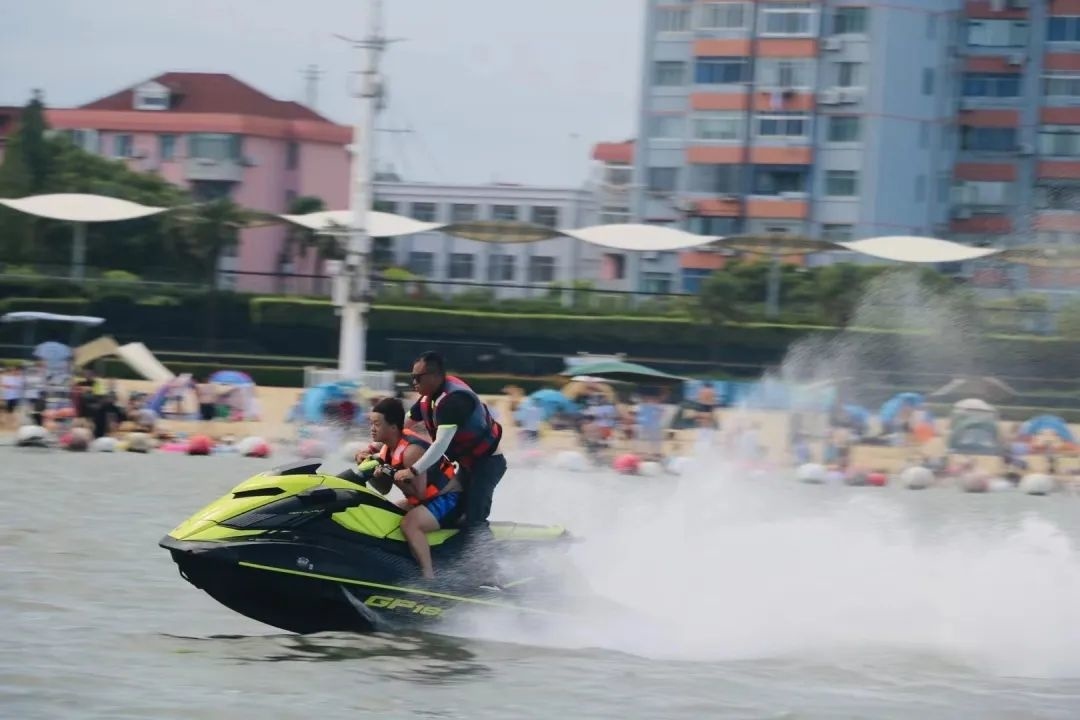 在沙滩游玩项目观景台附近,游客在教练员的指导下跨上了一台摩托艇,伴随着发动机轰鸣声和四溅的浪花,两人仿佛驾驭着一匹“野马”,在宽阔的湖面上飞驰而过,尽享体验“乘风破浪”带来的速度与激情。
