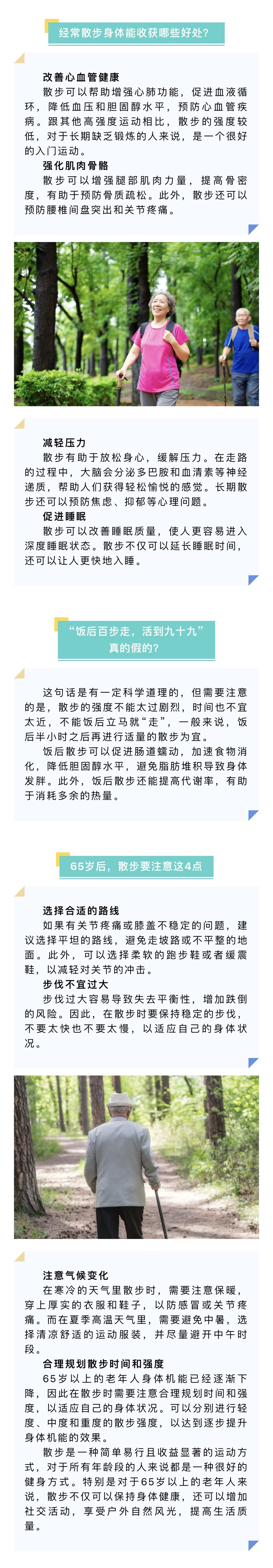 散步是一项简单而有效的锻炼方式,它可以不仅有助于放松身心,还能对身体带来许多好处。但是,65岁以后,散步时需要注意一些事项,一起来详细了解吧。