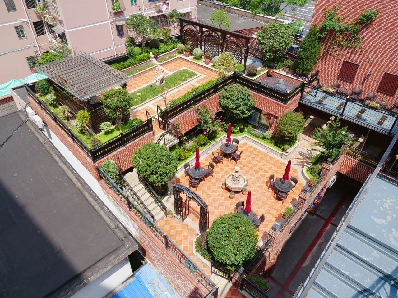 从室内穿过廊道,走进古典花纹装饰的大门,脚踏橙红色方格地板,油画样的风景让人眼前一亮,仿佛置身欧洲庄园……花园里,欧式喷泉水池与微型拱桥相伴,尖顶建筑、雅致雕塑与葱郁花草和谐相生,鲜活明媚的色彩交相碰撞,构成了一个个令人陶醉的景观。