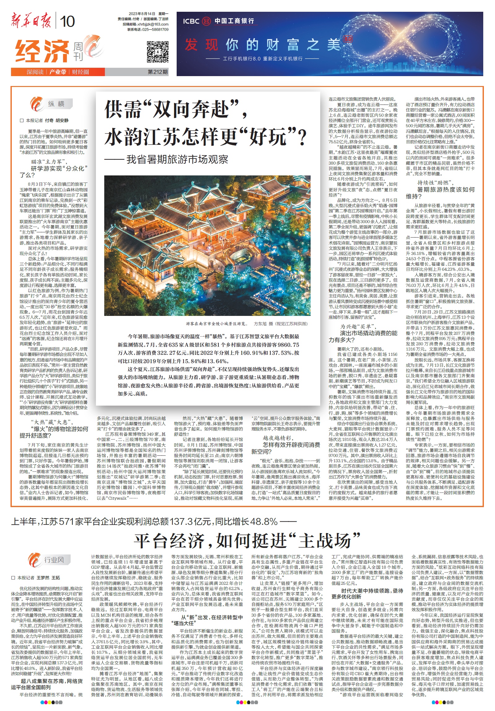 这个夏天,江苏旅游市场供需“双向奔赴”,不仅呈现持续强劲恢复势头,还爆发出强大的市场吸纳能力。从旅游主力看,研学游、亲子游更重质量;从暑期业态看,博物馆游、夜游愈发火热;从旅游半径看,跨省游、出境游恢复热度;从旅游供给看,产品更加多元、高质。