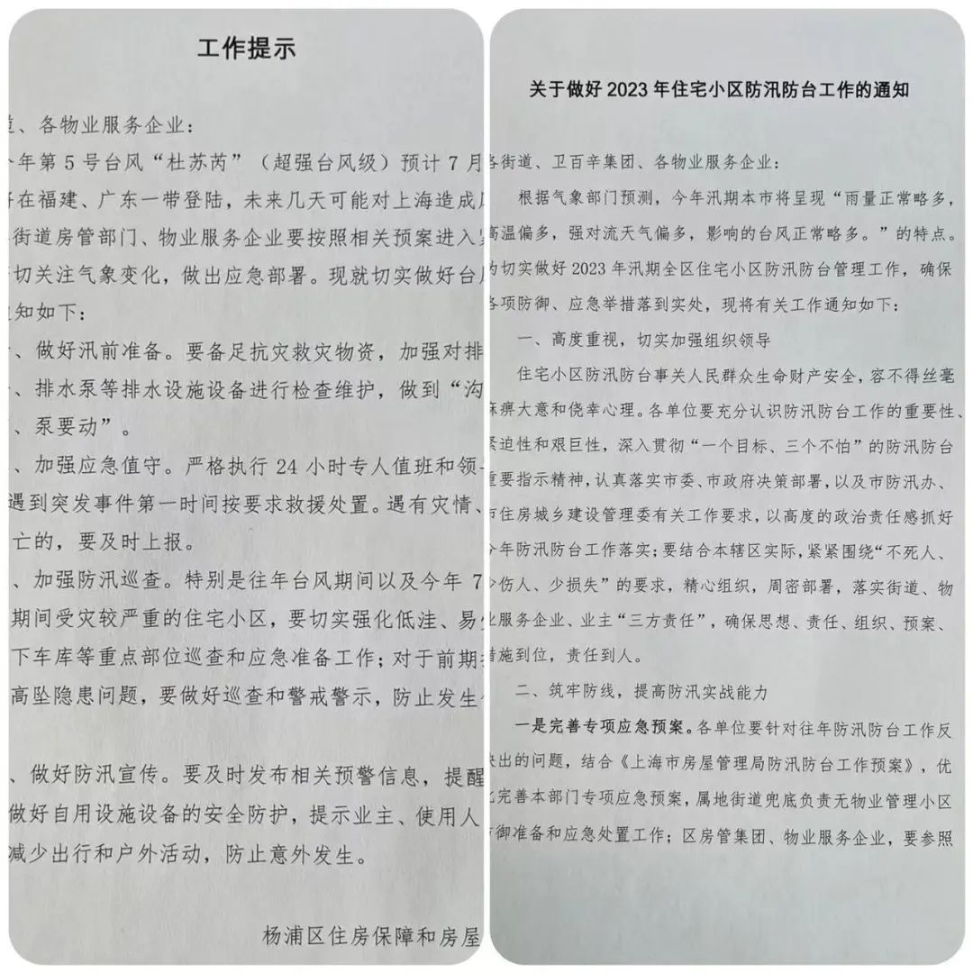 第一时间传达市、区关于防御“杜苏芮”和“卡努”台风工作的要求,密切关注台风发展态势,及时向各街道、房管集团、物业服务企业和修缮项目、拆房项目等现场管理单位下发工作提示,要求各单位立即进入实战状态,全面开展自查自纠,落实防汛防台物资和应急队伍准备,做到提示在前、部署在前、行动在前。不断完善房管系统防台防汛应急预案,确保执行畅通,不留死角、不留盲区、不留隐患。