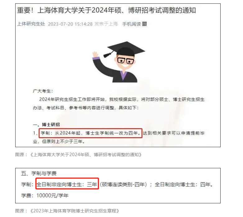 7月20日,上海体育大学发布关于2024年硕、博研招考试调整的通知,其中明确,从2024年起,博士生学制统一改为四年。