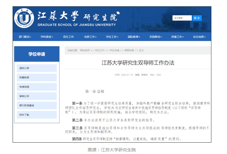 江苏大学研究生院则于去年1月发布了《江苏大学研究生双导师工作办法》,工作办法提出为了进一步提高研究生培养质量,加强科教产教融合研究生联合培养,鼓励教学科研团队合作指导研究生,专业学位研究生培养由校内指导教师(主导师)和校外实践指导教师(副导师)共同指导。在学校共建的联合培养基地中进行科教产教联合培养的研究生也由双导师共同指导。