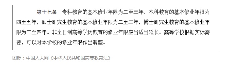 同样的,博士“四年学制”在国内高校中也屡见不鲜。山东大学《2023年招收攻读博士学位研究生章程》明确,本科直博研究生基本学制为5年,硕博连读博士研究生基本学制为3年,申请考核博士研究生基本学制为4年。《北京理工大学2023年博士研究生招生简章》也提出,博士研究生基本学制为4年,最长不超过6年,本直博、硕博连读基本学制为6年(含硕士),最长不超过8年。