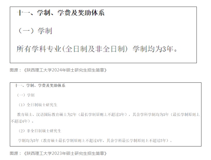 7月10日发布的《陕西理工大学2024年硕士研究生招生简章》显示,该校所有学科专业(全日制及非全日制)学制均为3年。