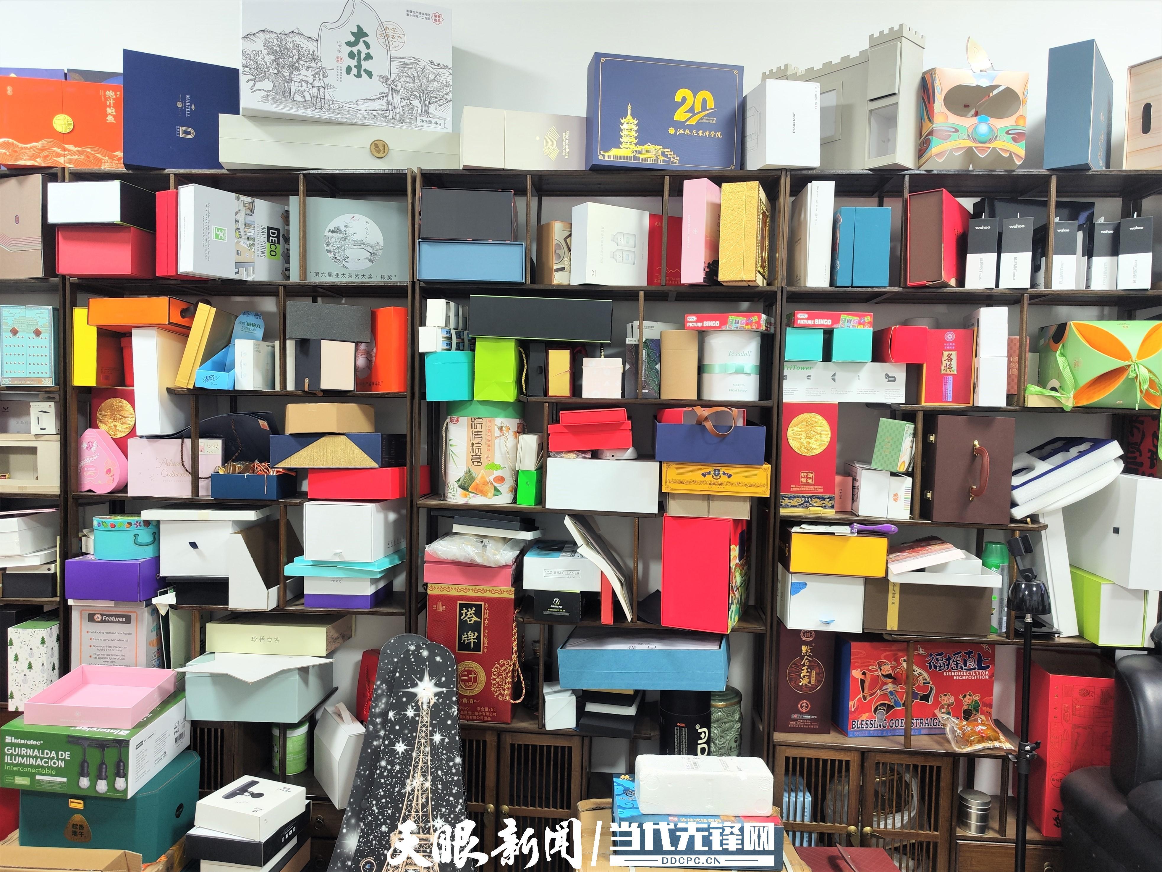 穿过宁波余姚嘉祈包装有限公司(以下简称嘉祈包装)的生产车间,来到厂房楼顶一侧30多平米的一间办公室内,百余款精美的包装礼盒摆满整面墙,这既是嘉祈包装创始人何师云日常工作的办公场地,也是其洽谈会客的展示大厅。
