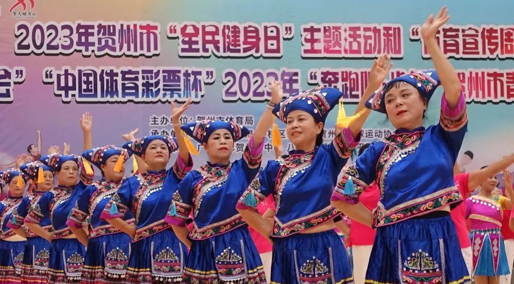 8月8日,广西贺州市群众表演民族健身舞