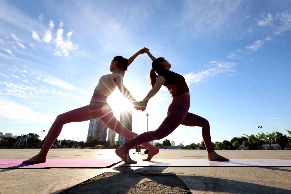 8月8日,市民在山东省枣庄市东湖公园练瑜伽