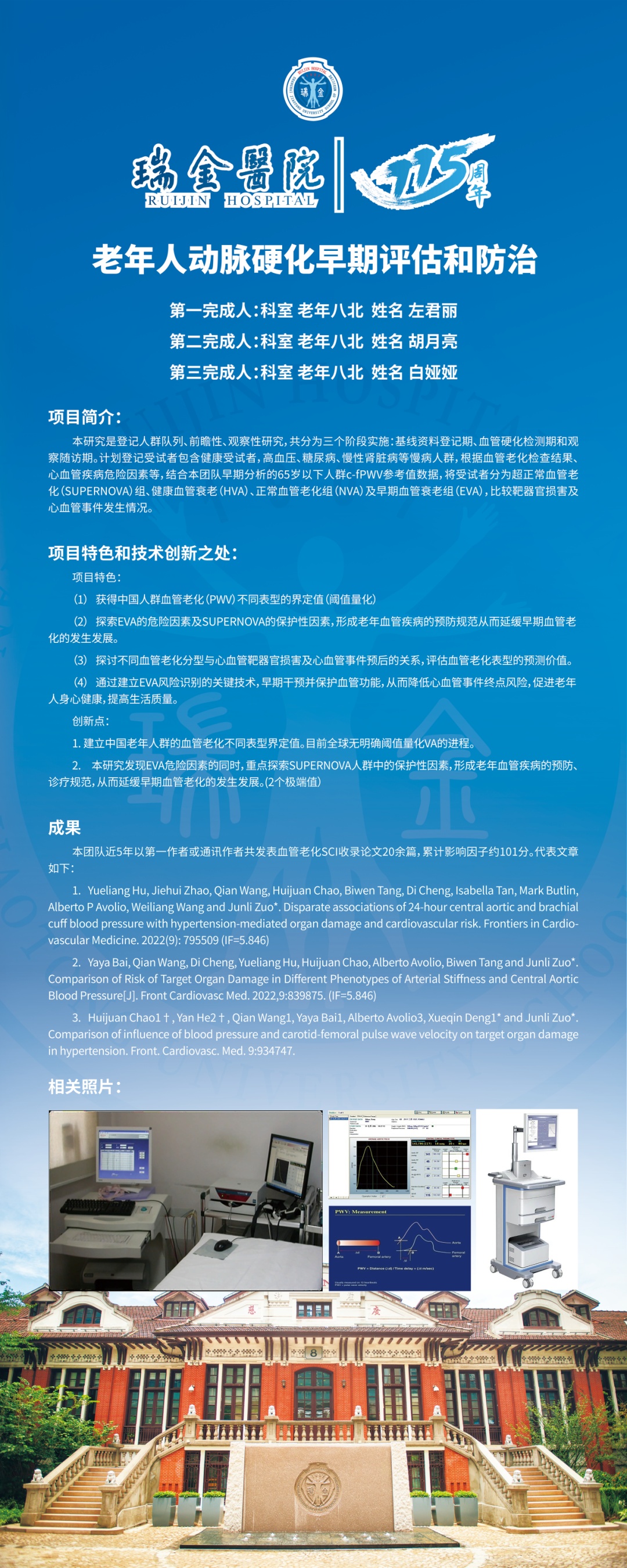 目前该技术已通过FDA等65个国家的认证, 2017年,瑞金医院引进同步测量颈股脉搏波速度和中心动脉压的技术,此后,澳大利亚血管老化研究方面专家Alberto教授团队为该无创技术提供了有力的技术支持和数据分析指导,两家团队合作,共同推广血管硬化检测仪在心血管内科、高血压科、老年病科、神经内科、肾脏内科等领域的应用,通过主动脉脉搏波分析和肱动脉血压结合使用对患者进行精确分型,以期达到个体化、精细化的诊疗模式。