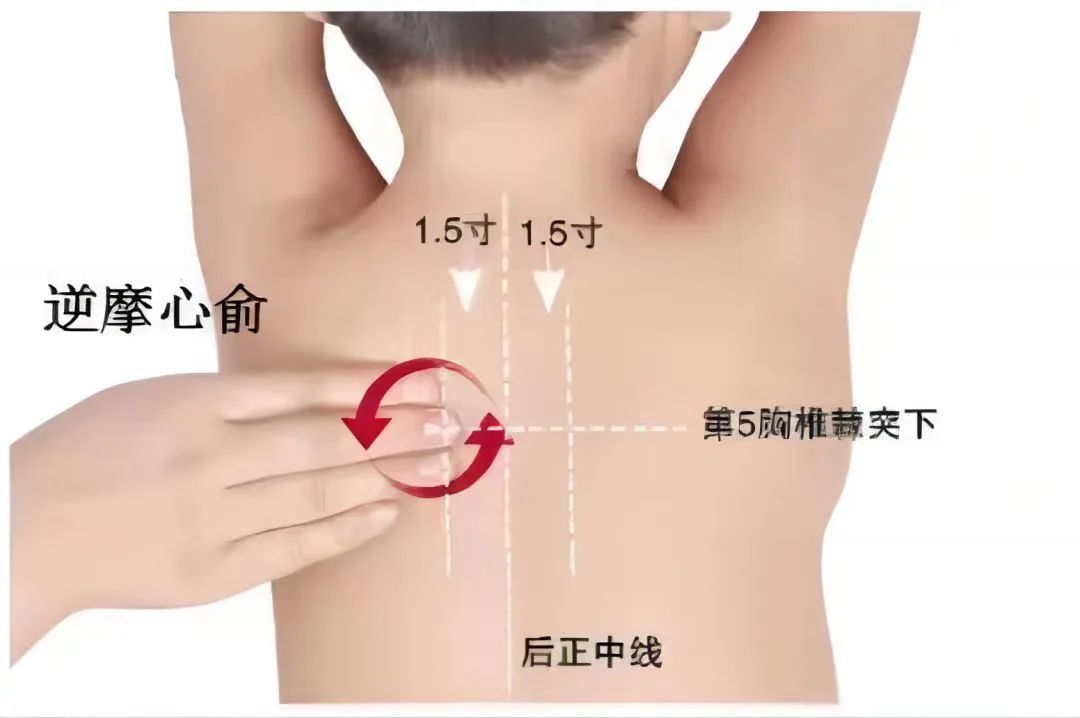 心俞,在背部,当第5胸椎棘突下,旁开1.5寸处。操作者食、中、无名指三指指腹摩孩子两侧心俞,摩50~100次。