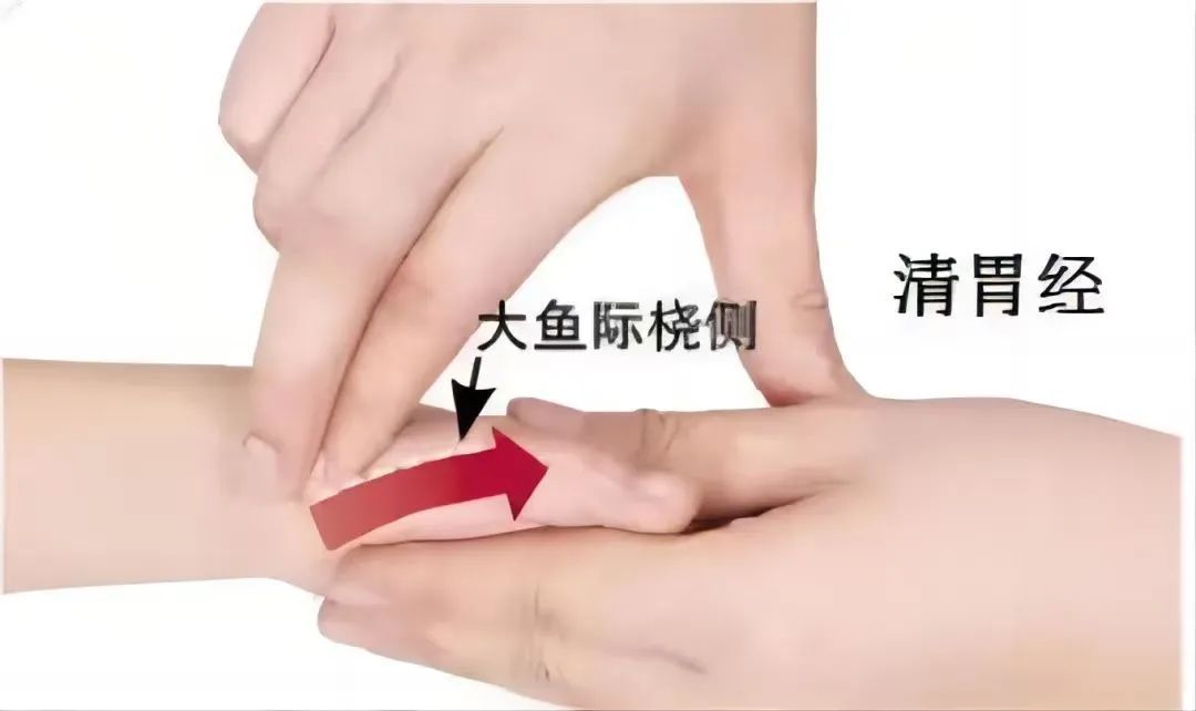 操作者食指自孩子大鱼际桡侧掌根推至拇指根,推100~300次。