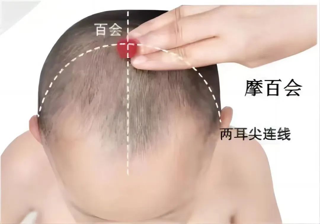 操作者右手食指、中、无名指三指摩孩子两耳尖直上,头顶中央处,摩100~200次。
