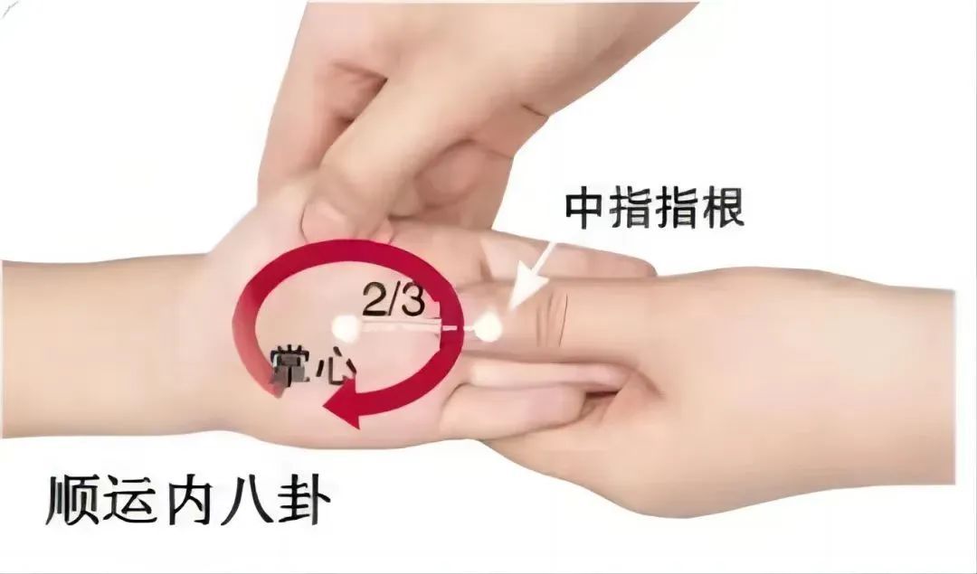 内八卦位于手掌面,以掌心(劳宫穴)为圆心,以圆心至中指根横纹内2/3和外1/3交界点为半径,操作者顺时针画圆,运50~100次。