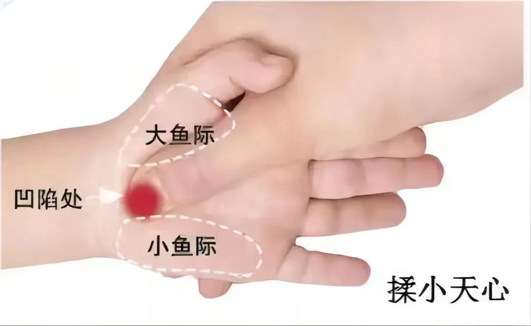 操作者拇指指腹揉孩子大小鱼际交接凹陷处,揉300次。