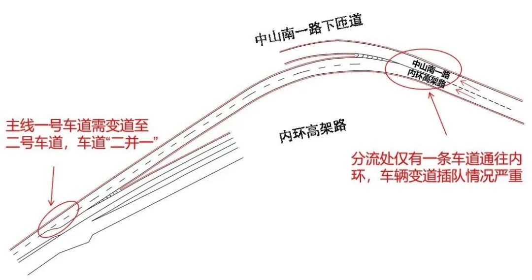 一、内环、中山南一路分流处通行资源分配与流量需求不匹配