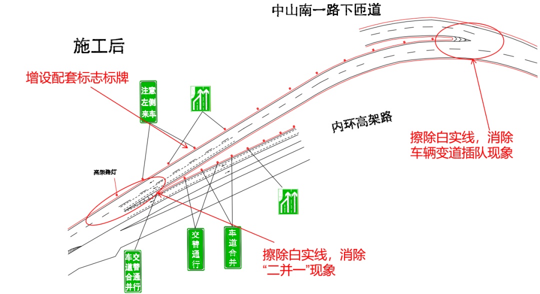 擦除原内环、中山南一路之间的白实线,这样引桥处的二号车道车辆无需变道至一号车道处,即可直接进入内环,同时也可以进入中山南一路下匝道,原二号车道“一分为二”,从两根车道(一内环一地面)变为三根车道(两内环一地面),相当于新增了一条通往内环高架路方向车道。