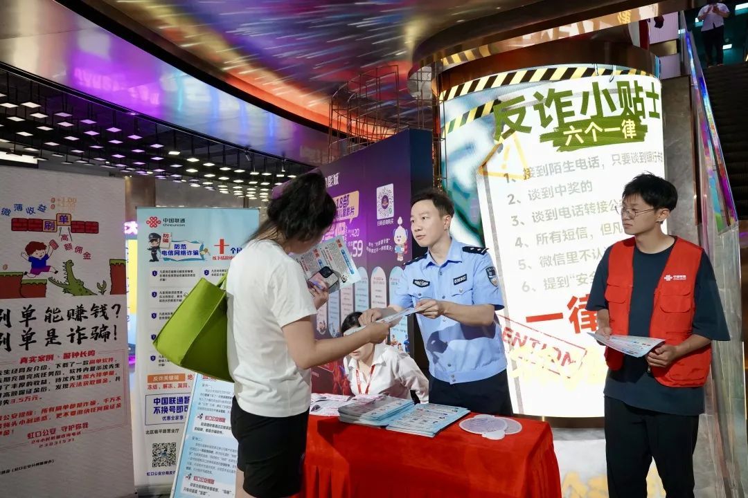 在寰映影城太阳宫店大厅中,派出所民警给前来观影的观众们发放宣传单,耐心向他们普及防范电信网络诈骗的相关知识,让他们知道什么是电信网络诈骗、如何预防电信网络诈骗、被骗后如何报警。
