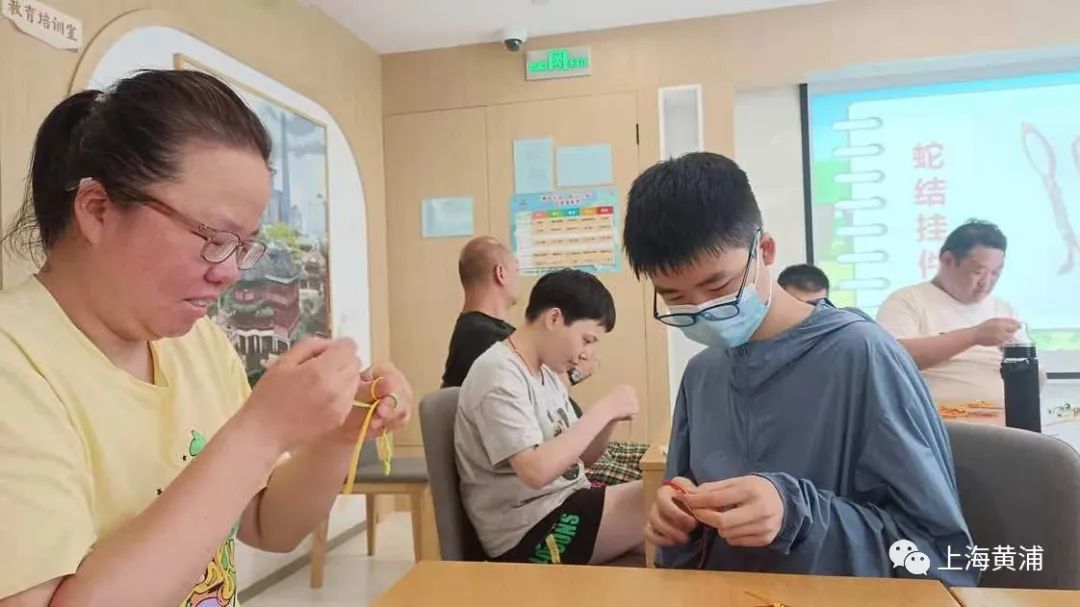 同样是课堂助理,九(1)班许胡杨的学员们有点不一样,这些残障人士的年龄可能不小,但是由于身体的原因,平常生活中简单的小事对于他们而言可能没那么容易。在许胡杨一边讲解一边示范并不断辅助下,终于,学员们的编绳结都完成了。许胡杨感慨道:“通过这次志愿者服务,我体会到了老师的艰辛与残障人士渴望学习的决心和信心,我会在今后的空余时间,争取多为残障人士服务。”