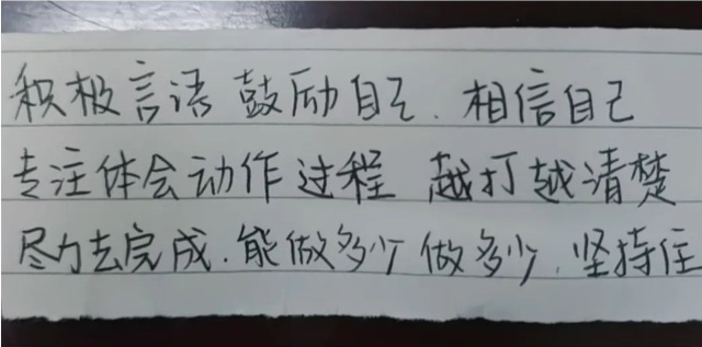 所以,姜冉馨的纸条,实际上就是她的一种心理训练的工具,是运动员自我暗示、积极言语的“定心剂”,是姜冉馨平日反复锤炼而出的意志力,是她直面压力、稳定发挥、勇夺冠军的真实写照。