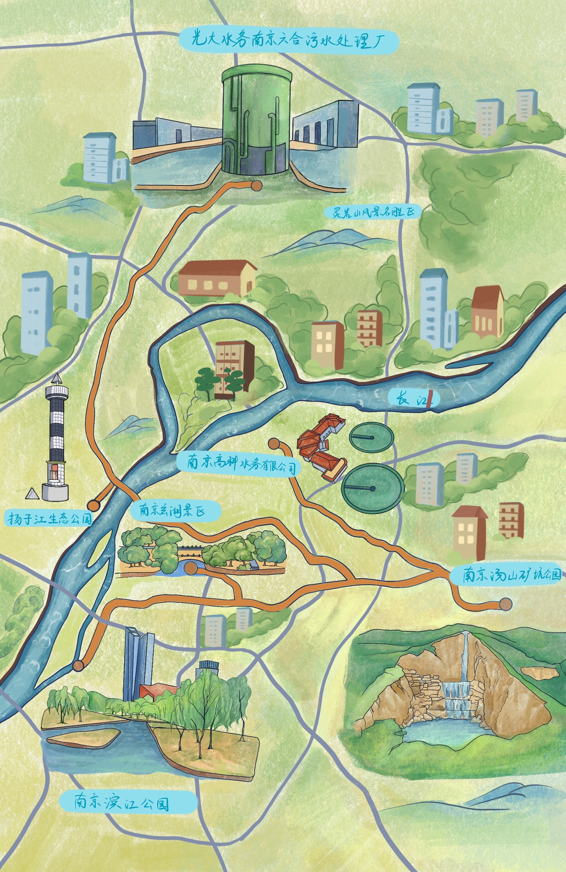 生态南京高科水务有限公司—南京汤山矿坑公园—南京滨江公园(青年文化公园段)—南京市玄武湖公园管理处—光大水务南京六合污水处理厂—扬子江生态公园