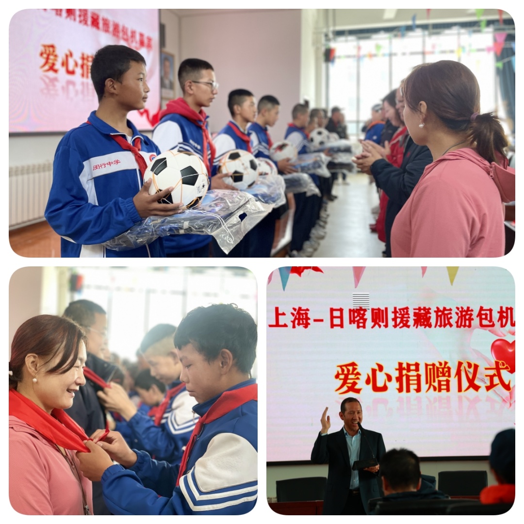 参观结束后,嘉宾们齐聚学校多功能厅二楼举行简短而隆重的“上海——日喀则”援藏旅游包机嘉宾爱心捐赠仪式,本次捐赠物资包括足球、书包等学习用品。