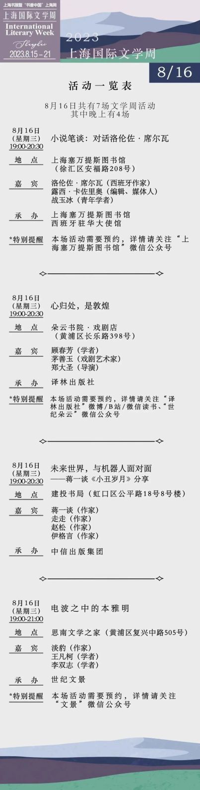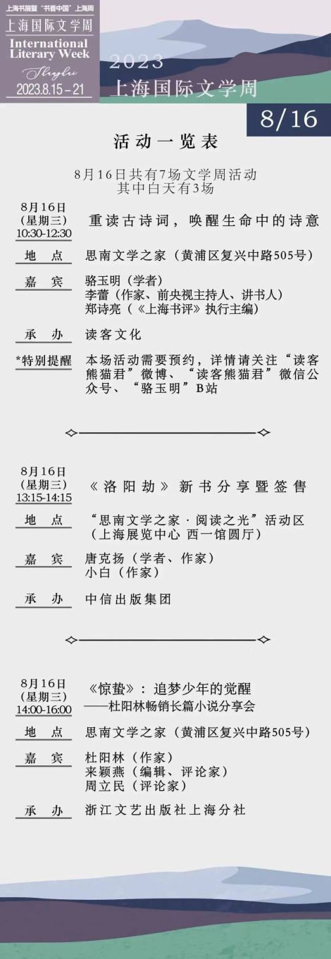 作为上海书展的一个重要单元,上海国际文学周在16日有7场活动举行。13:15在上海展览中心西一馆圆厅,学者、作家唐克扬带来新书《洛阳劫》分享会。在主会场之外,10:30在思南文学之家,学者骆玉明与作家、前央视主持人李蕾、《上海书评》执行总编郑诗亮“重读古诗词,唤醒生命中的诗意”;19:00在塞万提斯图书馆,编辑、媒体人露西·席尔瓦和青年学者战玉冰对话西班牙作家洛伦佐·席尔瓦。