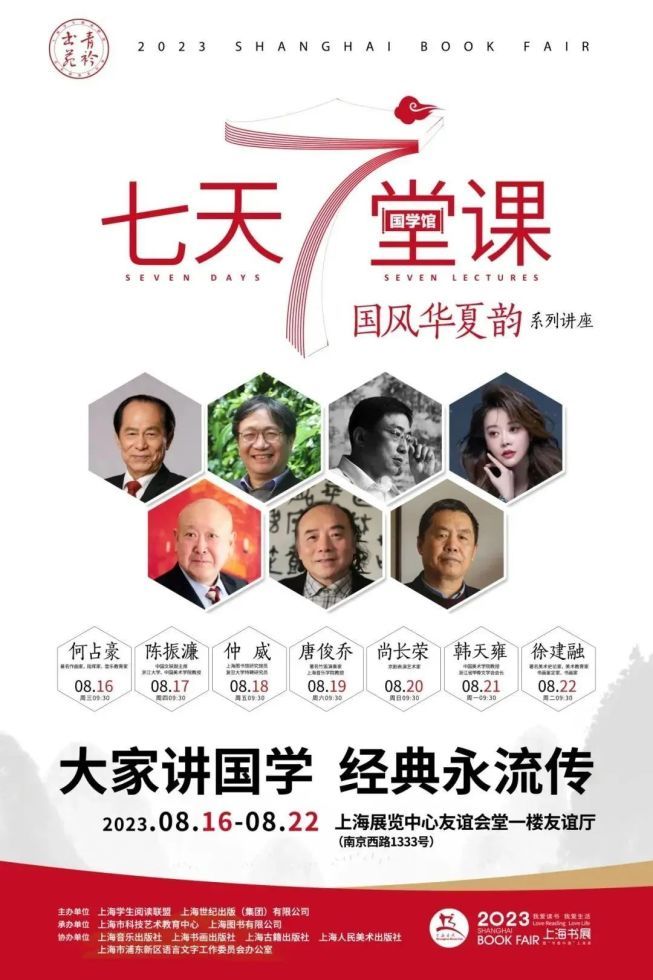 “国学七天七堂课”是上海书展的精品系列阅读活动,由上海世纪出版集团主办,以弘扬优秀传统文化、精读国学经典为主旨,在书展7天时间里,每天开讲一门“国学课”。16日首场活动为9:30在友谊会堂友谊厅举办的“弦乐四重奏‘梁祝’的前世今生”。著名作曲家何占豪将与读者分享中国第一部小提琴协奏曲《梁祝》诞生的往事。据悉,今年“国学七天七堂课”系列讲座将从弦乐、书法、碑帖、民乐、戏曲、篆刻、国画等中国传统艺术的角度,为读者奉上一场以“国风华夏韵”为主题的文化视听盛宴。
